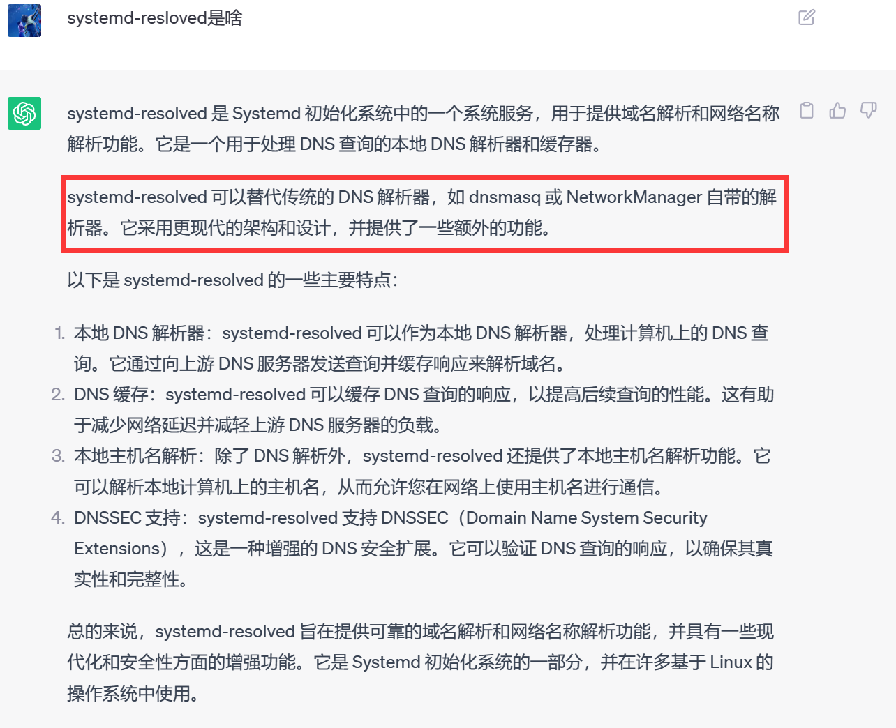 赶紧问问最好的伙伴——chat-GPT,systemd-resloved是干嘛的;